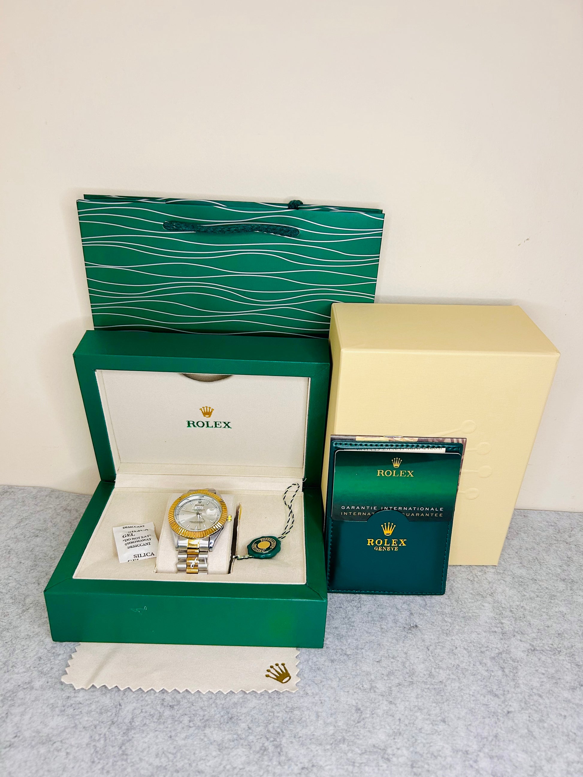 Off-White Dial Luxury Watch with Gold-Silver Chain – 42mm & Original Rolex Box